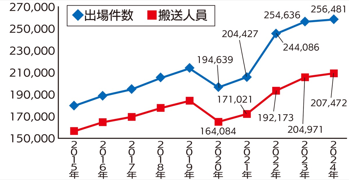 搬送人員は23年を2501人上回る20万7472人で過去最多。救急出動件数、搬送人員ともに3年連続で過去最多を記録した。