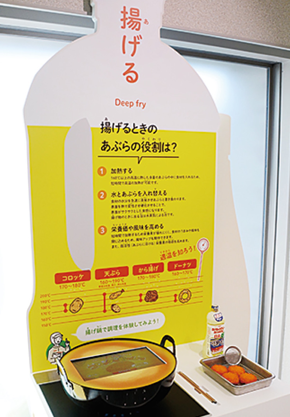 刷新されたあぶらミュージアムは、原料から製造過程、完成した製品までの流れが分かるように展示物を配置。身近な食べ物や日用品の中で「あぶら」(油脂)がどのように使われているかが分かるパネル展示、タッチパネルや映像、音でコロッケを揚げる体験ができるゲーム型の展示なども新設された。