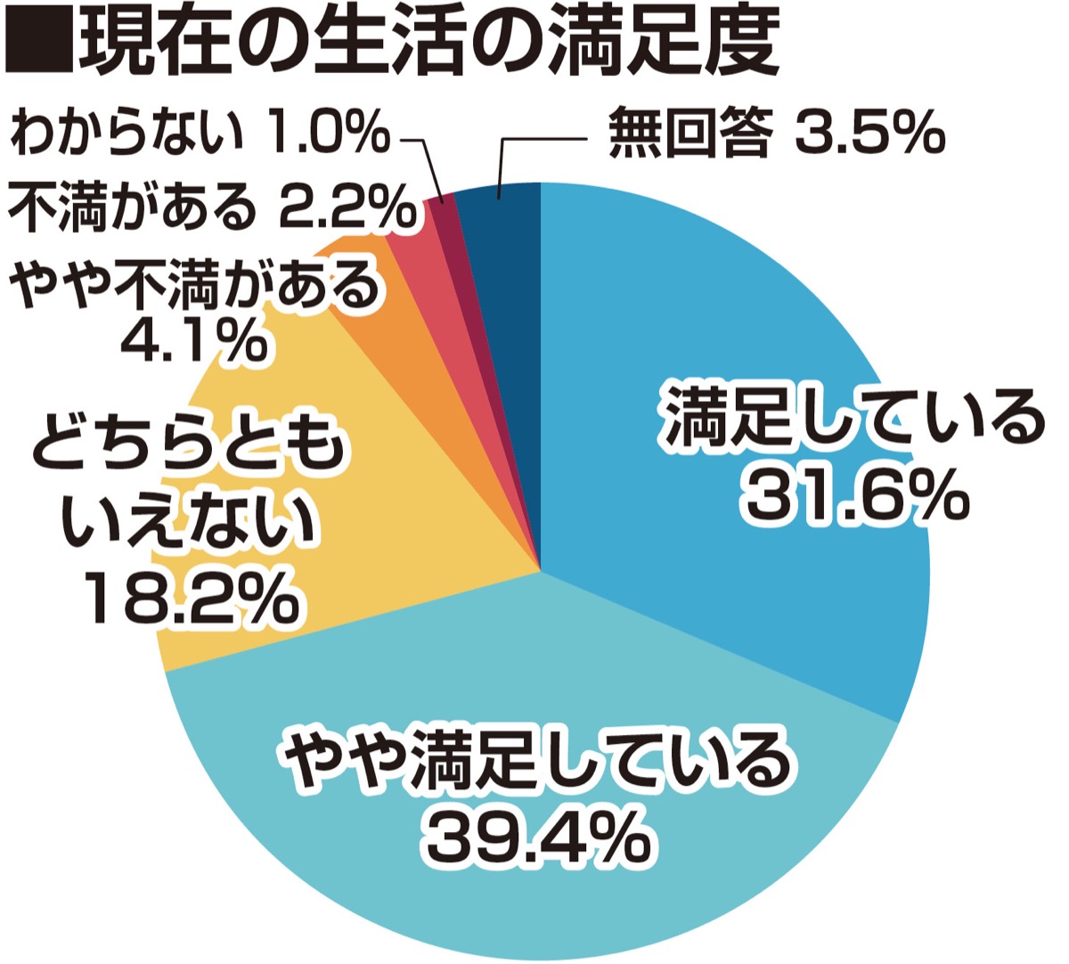 結果によると、現在の生活について「満足している」(31・6%)、「やや満足している」(39・4%)と回答した人の合計は71・0%に達した。この数値は前回の2019年度調査の64・1%から約7ポイント上昇した。