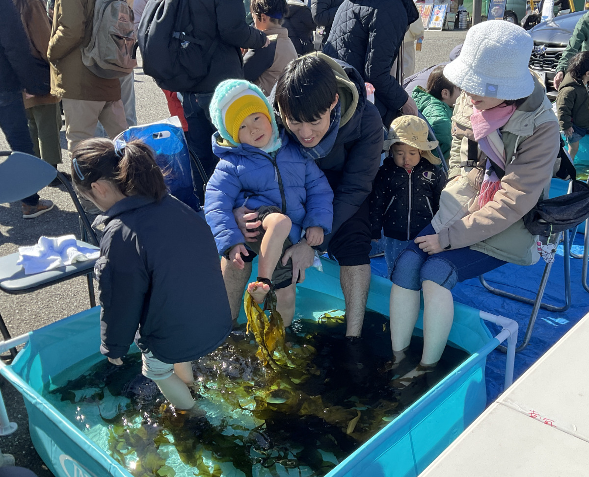 毎回人気の「生海苔むしり体験」に2年連続で参加した人は「歯応えがあって風味もあり、ここでしか味わえない美味しさ。いっぱいむしって持って帰りたい」と笑顔で話していた。また、会場内にはSDGsブースも設置。幸海ヒーローズは「おさかなの街づくりプロジェクト」第二弾としてコンブの足湯を開催。昨年12月に同漁港で植え付け、2mほどに成長したコンブが入った足湯を家族連れらが楽しんでいた。