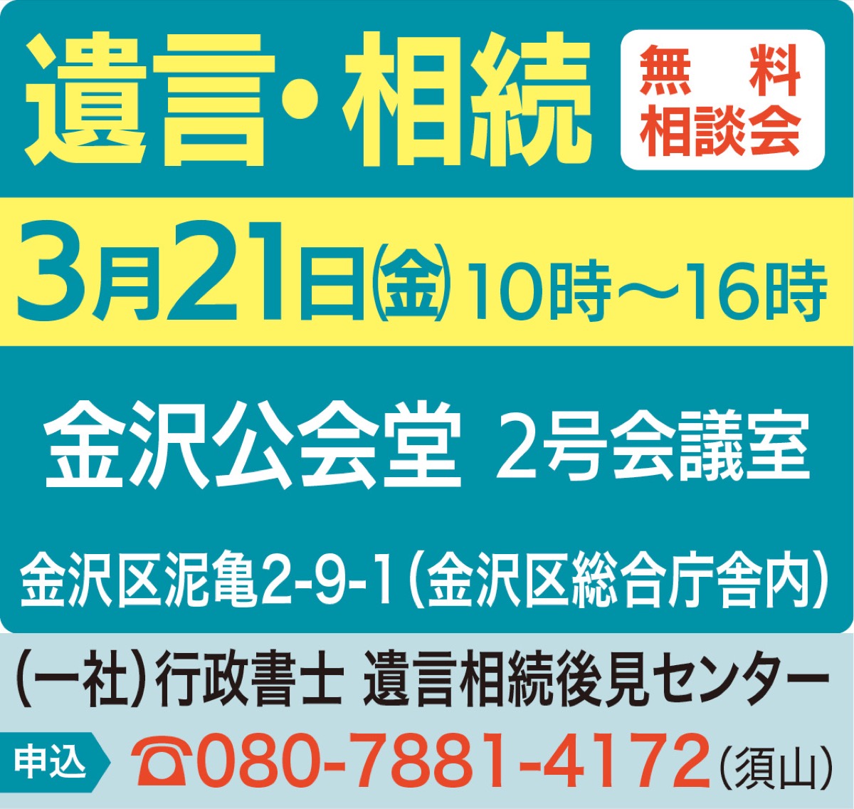(一社)行政書士遺言相続後見センターが3月21日(金)、午前10時から午後4時、金沢公会堂(金沢区総合庁舎内)で第37回無料相談会を開催する。予約優先、当日参加可。
