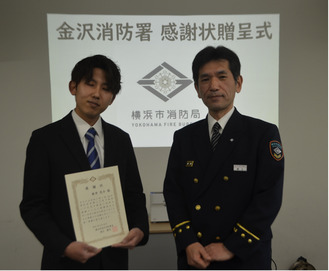 金沢区内ガソリンスタンド前の植え込みから出ていた炎を消火したとして、金沢消防署(間正勝司署長)は3月18日、市内在住の新井悠介さん(26)に感謝状を贈呈した。