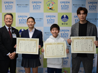 3人に賞状を手渡した高橋功区長は「皆さん夢が世界を向いていて素晴らしい。それぞれの道で頑張ってほしい」とエールを送った。