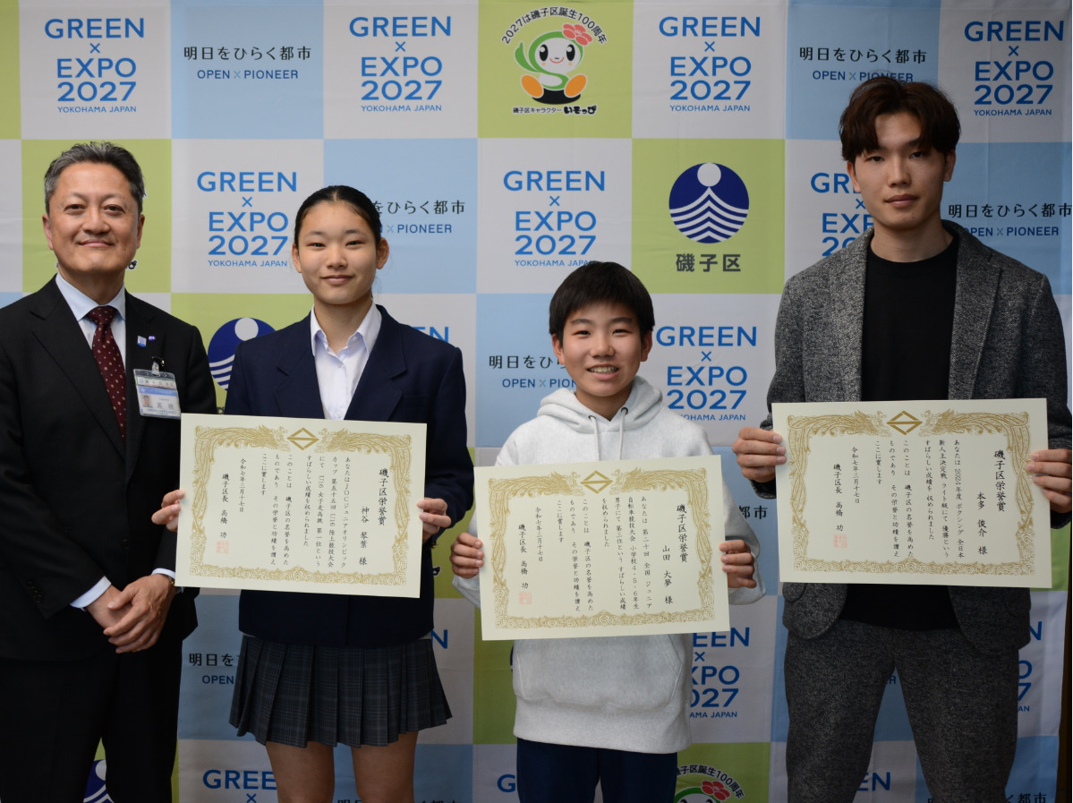 同賞は文化・スポーツ・学術・保健福祉などの分野で、著しい功績をあげた個人・団体に贈られる。今回は神谷琴葉さん(岡村中3年)、山田大夢さん(杉田小5年)、本多俊介さん(区内栗木在住)の3人が受賞した。神谷さんは陸上部に所属し、「JOCジュニアオリンピックカップ第55回U16陸上競技大会」U16女子走高跳で第1位を獲得。山田さんは「第20回全国ジュニア自転車競技大会」小学校4・5・6年生男子で3位に入賞した。本多さんは2024年度のボクシング全日本新人王決定戦のライト級で優勝。それぞれが全国規模の大会で優秀な成績を収めた。