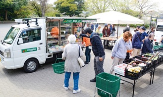 場所は夏祭りなどの会場にもなる公園で、実施は毎週火曜日午後2時30分から3時。マルエツ井土ヶ谷店=南区=から移動販売車が配車され、野菜・果物・肉・魚などの生鮮食品や惣菜、パン、生活用品など約500品目を販売する。上限55円の移動販売手数料がかかるが、当日の店頭価格と同じ金額で商品を購入できる。