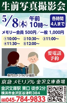 そこで、金沢文庫駅から徒歩2分の「京急メモリアル金沢文庫斎場」は5月8日(木)、完全予約制の撮影会「生前写真撮影会」を開く。リラックスした雰囲気の中で専門カメラマンが撮影。「お元気なうちに自分の納得する一枚を残してみては」と同社は話す。