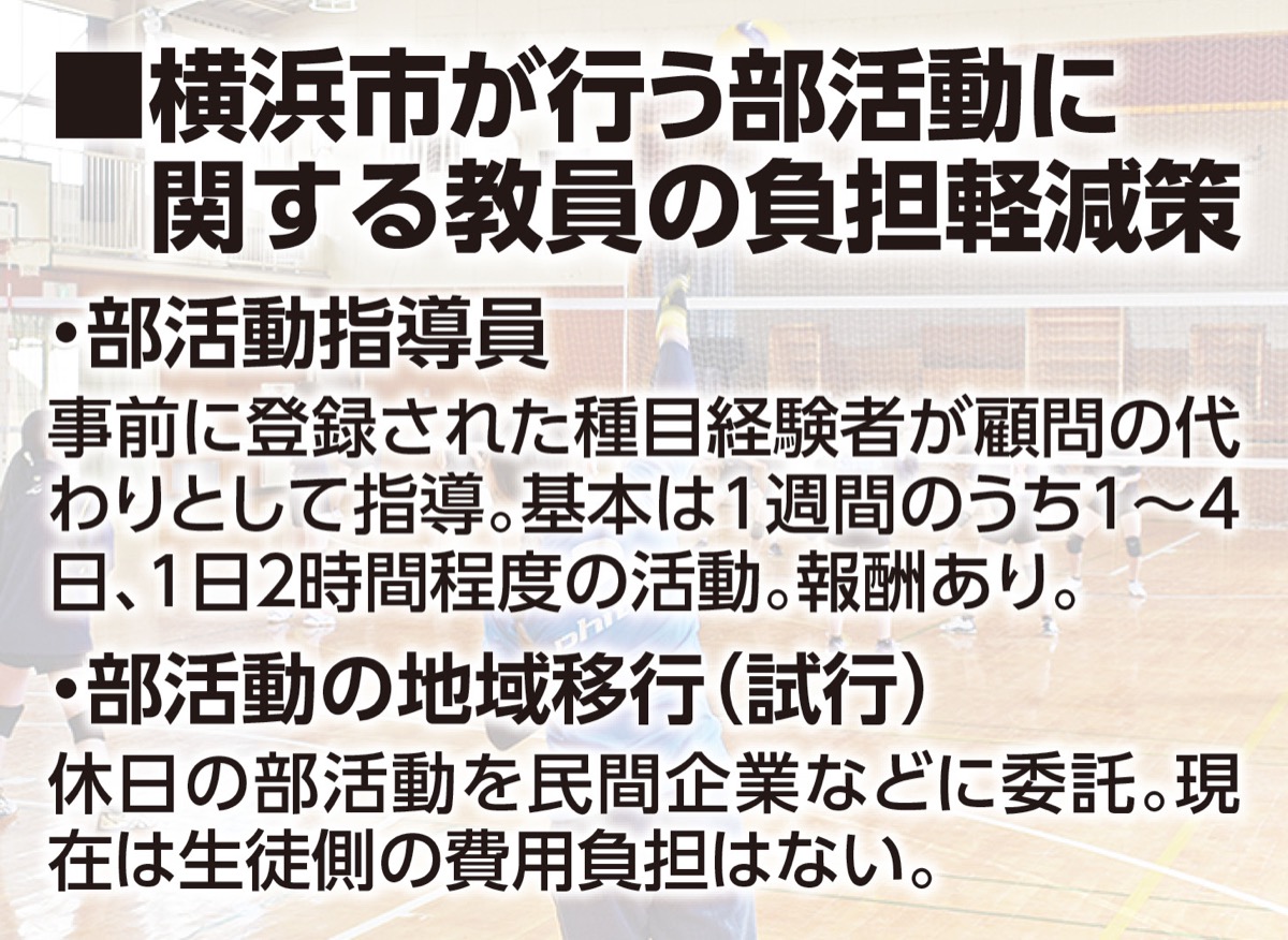 教員の働き方改革を進める横浜市は、中学校の部活動顧問の負担軽減策として、教員以外が指導できる制度の活用を進めている。生徒らから外部人材の指導を歓迎する声がある一方、教員以外が学校施設を使用することなどの課題もある。市は課題を整理し、「持続可能な部活動を目指したい」としている。