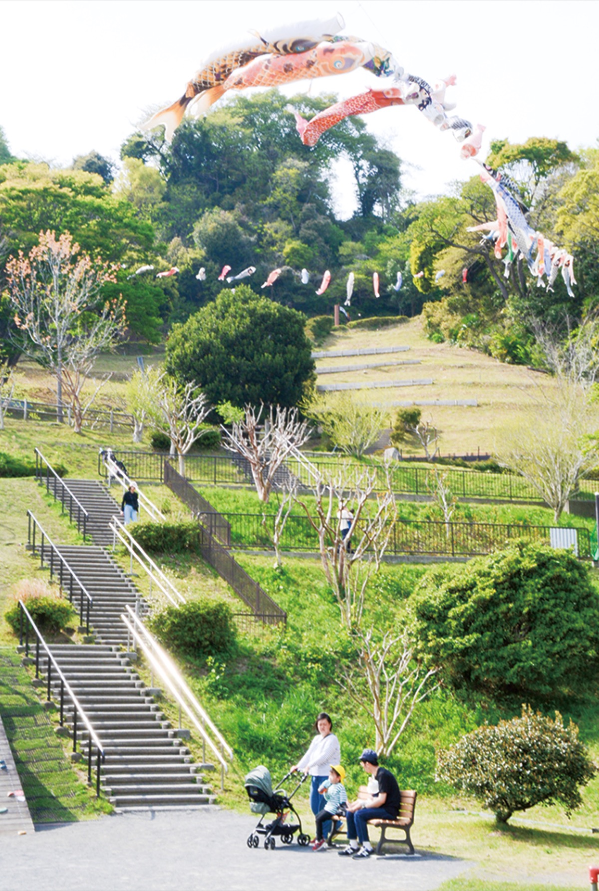 金沢自然公園=金沢区釜利谷東=では、こども広場の上空に約70匹のこいのぼりが登場=下写真。ローラーすべり台などのアスレチックで遊ぶ親子たちを見守るように、大小色とりどりのこいのぼりが泳ぐ姿を見ることができる。掲出は5月6日(火)まで。