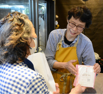 そこで区は近年、がんの予防や早期発見・治療により、がんで亡くなる人の減少を目指して検診の重要性を広めようと、さまざまな啓発を展開してきた。その一環で今年度は区内の生花店に協力を呼び掛け、早期発見を目的とする自己検診用の手袋とがん検診の案内チラシなどをまとめたグッズ約1000セットの配布を企画。協力店の一つ「おくやま花店」=杉田=の店主・奥山あや子さんは「母の日前はお客さんが多くなるので、良いアイデアだと思った。パッケージも可愛くて、喜んで受け取ってもらえている」と話す。