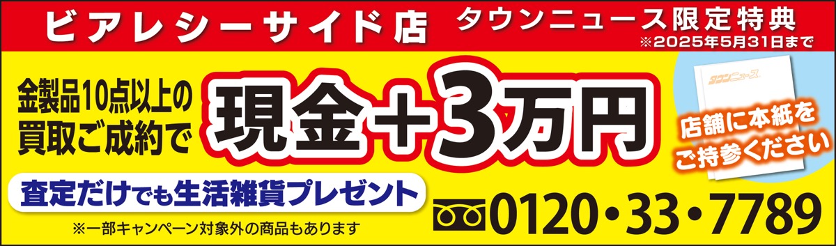 金沢区並木の商業施設「ビアレヨコハマ」内にある買取専門店「おたからやビアレシーサイド店」では、高値が続く金製品の買取を強化している。5月末までは金製品10点以上の買取成約で、買取金額に現金3万円を上乗せして進呈。スタッフは「金の価格が最高値を更新しています。自宅に眠った金製品があれば、この機会に査定してみませんか」と話す。