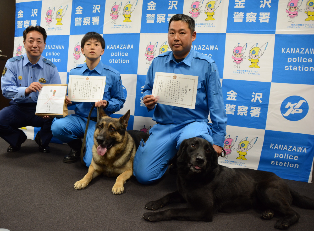 表彰を受けたのは、神奈川県警察鑑識課に所属するジャーマンシェパードのムート号(オス・4歳)と、ラブラドールレトリーバーのゼブラ号(メス・7歳)。2頭は5月7日、前日から行方不明となっていた金沢区内在住の60代女性の捜索を行い、鎌倉市内の山中で家族が見つけた女性のバッグから匂いをたどり、ムート号が女性を発見した。女性は衰弱していたものの、命に別状はない状態で救助された。