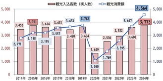 これは、これまでの最高値である2015年の客数3761万人、2019年の消費額3762億円をそれぞれ上回る数値。観光消費額の内訳は宿泊が2581億円、日帰りが1983億円。宿泊客の平均消費額は24年に5万553円と、右肩上がりで増加している。