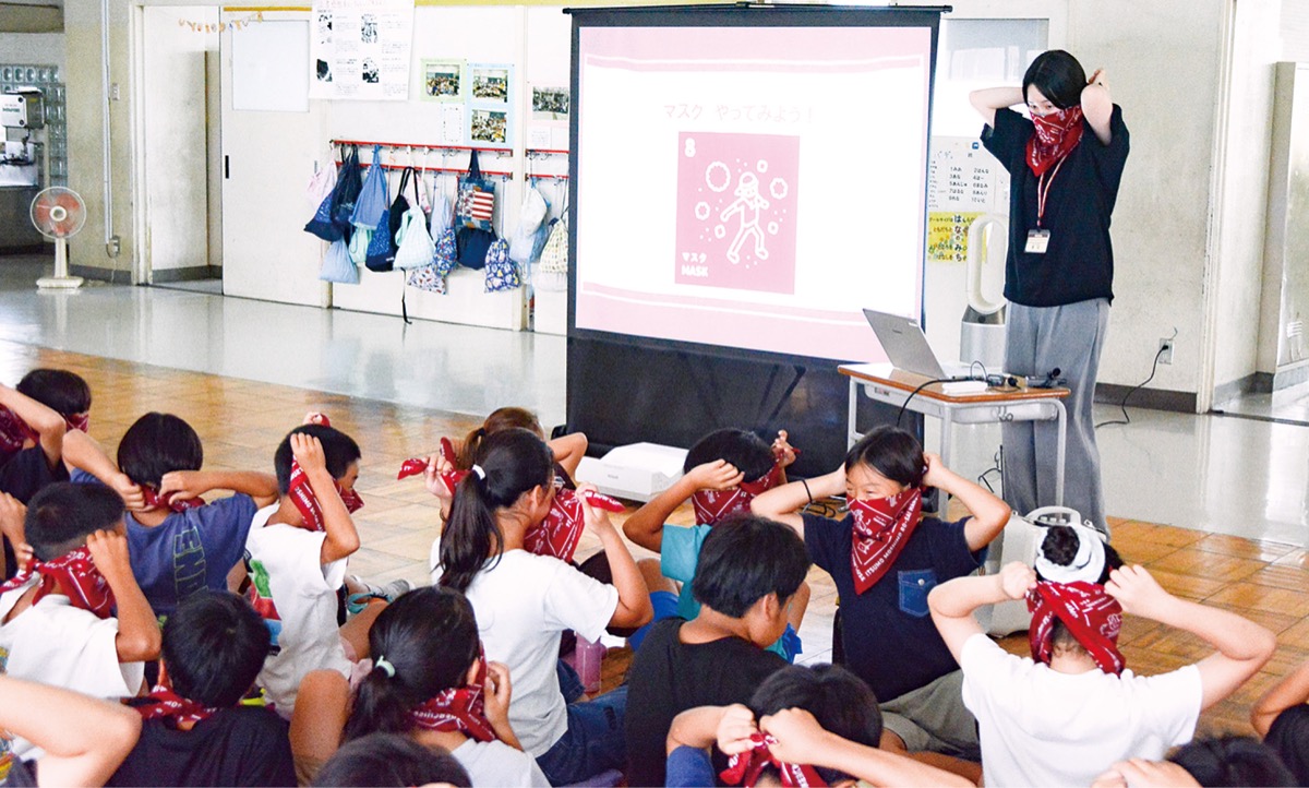 また、同店は包帯や風呂敷などさまざまな使い方ができるハンカチを児童たちへプレゼント。その場でマスクとしての活用法も実践した。同店の須藤陸店長は「身近なものがもしもの時に役に立つ。おうちの人とも話してみてほしい」と児童たちに呼び掛けた。