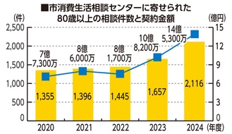 年代別では、80歳以上からの相談が23年度比27・7%増の2116件で、最も高い増加率を示している。次いで、70代が15・1%増の2322件、60代が11・7%増の2272件と、高齢層での増加が顕著である。