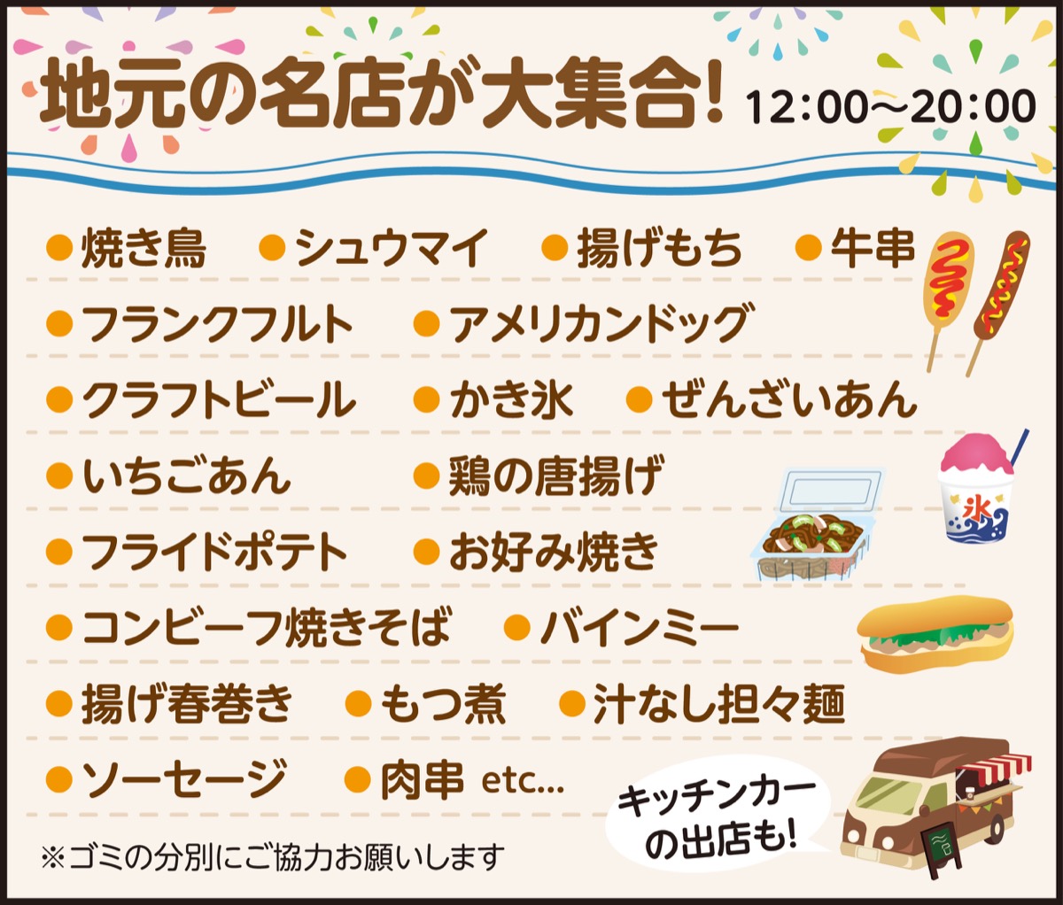 今年は19の会員が出店。海の公園の砂浜沿いに、焼き鳥や牛串、焼きそば、唐揚げ、お好み焼き、バインミー、汁なし担々麺、かき氷、クラフトビールなどを販売する店が並び、キッチンカーも8台登場する。