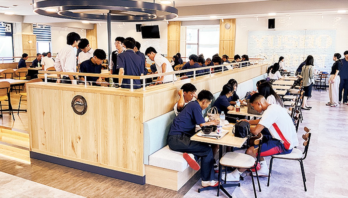 食堂は室内に189席、屋外テラスに56席が設けられている。食事だけでなく、自習もできるようにコンセントやカウンター席なども設置されている。また、食堂の壁面には、生徒一人ひとりがメッセージを書いた付箋を貼ることで一つの絵が完成する「ポストイットアート」を配置。文化祭や入学式など季節やイベントに応じて生徒参加型のアートが完成する。