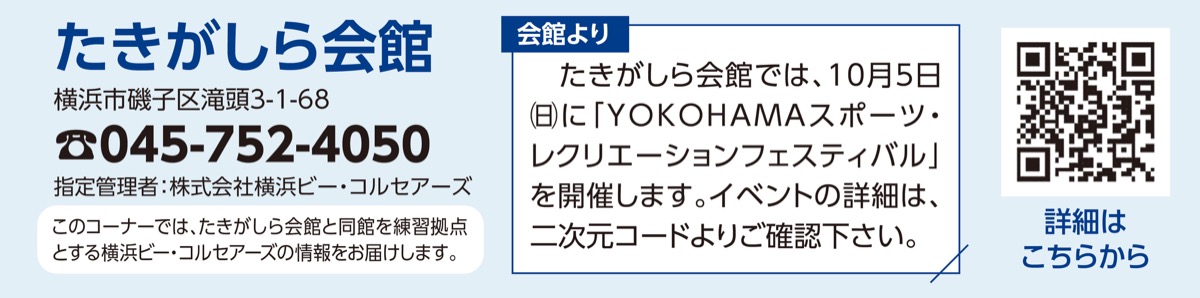 オフシーズンでは、たきがしら会館での練習だけでなく、平塚での上海シャークスとの練習試合や初めてのヨーロッパ遠征も実施。昨季から所属する9人と新加入選手の連携を深めながら、3季ぶりのCS出場を目指す。在籍6年目を迎える港南区出身の須藤昂矢選手は「レベルの高いチームと練習試合ができるのは貴重。この経験を生かして開幕へ向けて準備したい」と話す。