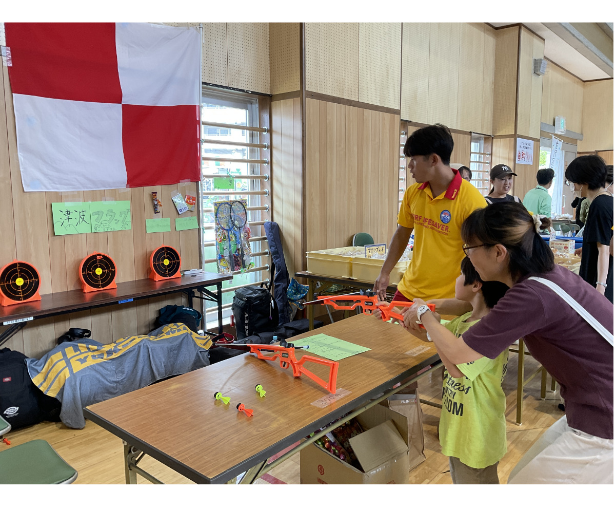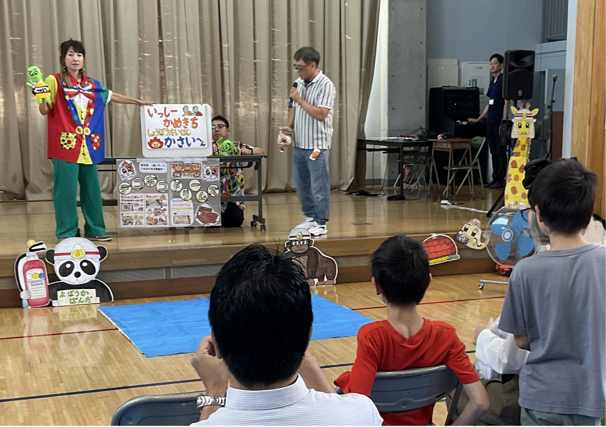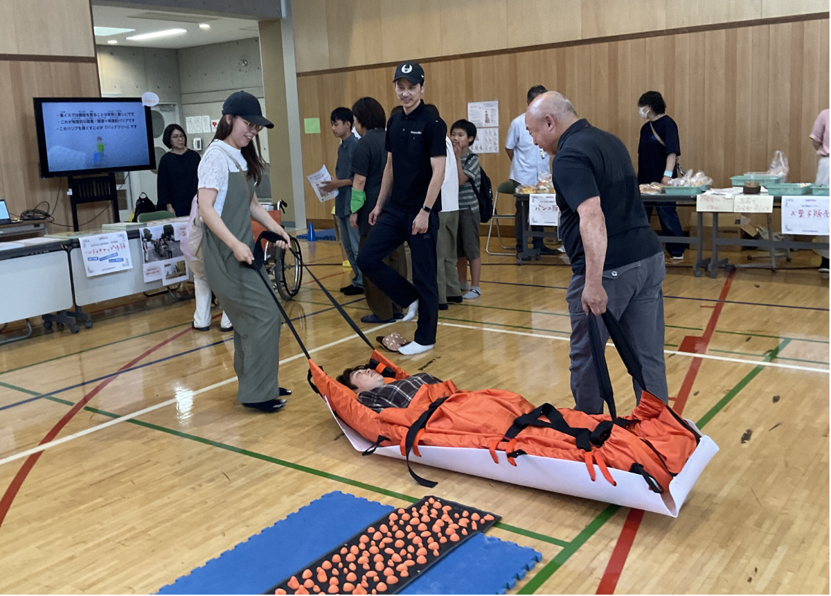 開会式で自助リハ実行委員長の座間吉成さんは「災害に備え、どんなことを準備したらいいのか学びながら笑顔で終われるイベントになれば」とあいさつ。当日は、横浜海の公園ライフセービングクラブと消防団員による心肺蘇生法体験や、津波フラッグの掲示、空気を応用した担架「エアーストレッチャー」などの救護支援資材の展示・体験や、昨年まで東富岡消防出張所に勤務していた消防士の蛭田伸一さんが代表を務める紙芝居サークル「デコボコドリームズ」による防災紙芝居なども披露された。