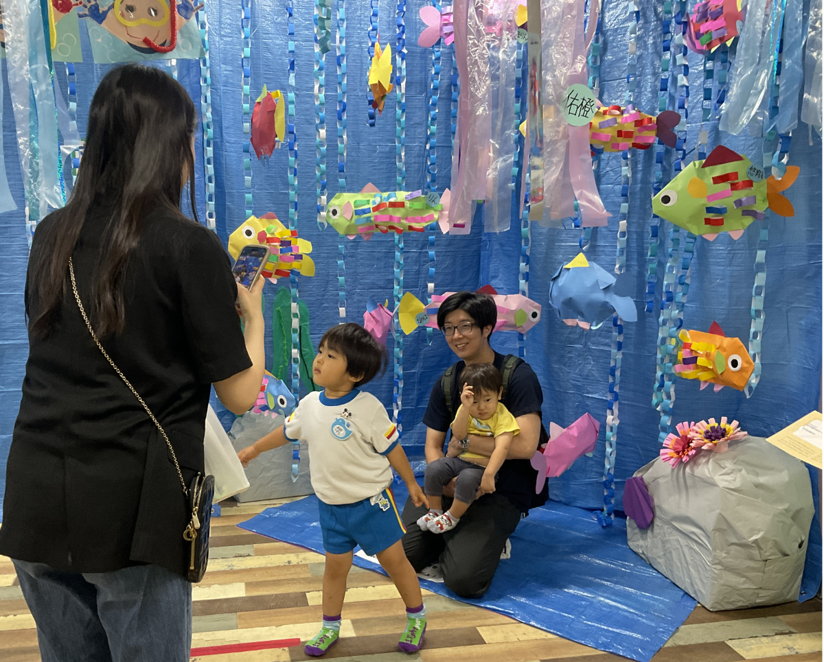 今年はクラスごとに空や遊園地などをテーマに設定。海をテーマにした3歳児クラスでは、子どもたちが好きな魚の形や色を選び、目玉や背びれ、胸びれを貼り完成した魚と写真を撮れるフォトスポットが登場した。