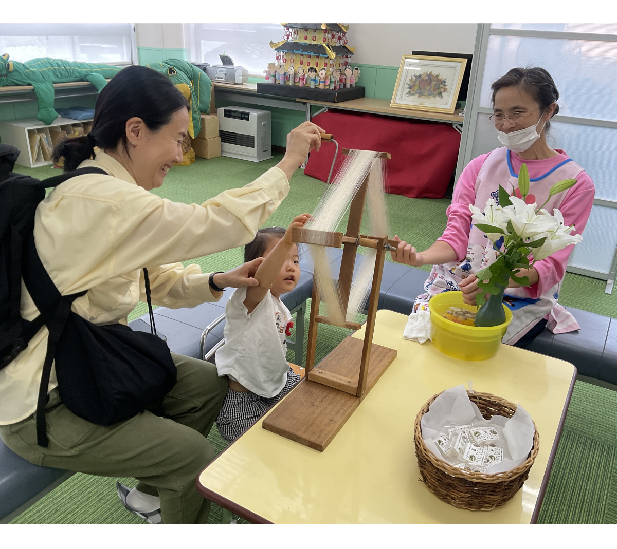 また、毎年年長児が蚕を飼育している同園では今年初めて、蚕の繭から出る糸を糸車で紡ぐ「親子で体験コーナー」も行われた。