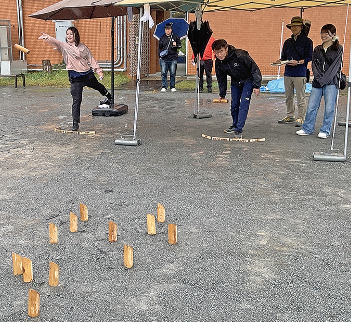 モルックは木製の棒を投げ、ピンを倒して先に50点ちょうどに達したチームが勝ちとなるフィンランド発祥のスポーツ。当日は交流大会が開かれる予定だったが、雨のため中止になり、希望者が参加し交流を深めた。