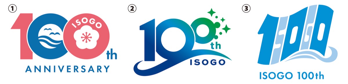 デザインは、実行委員会の広報部会が考えた3案=写真。それぞれ【1】磯子の「海」と区の木「梅」のモチーフを取り入れて海と豊かな自然を表現したもの、【2】水色で海と空、緑色で自然を表し、波形のラインで未来への一歩を表現したもの、【3】「ISOGO」の「I・O・O」を際立たせて100周年を表し、波のモチーフで未来へ勢いよく進む姿を表現したものとなっている。
