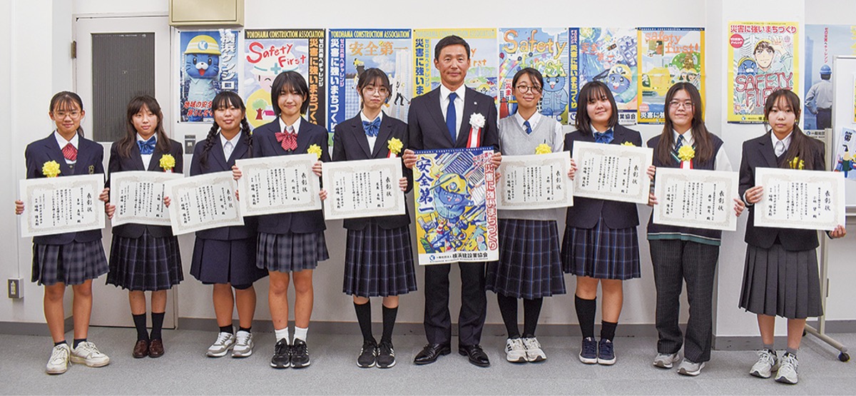 一般社団法人横浜建設業協会(福嶋隆太郎会長)の「建設ポスターコンクール」表彰式が11月7日、神奈川県建設会館=中区=で開かれた。同コンクールは2017年から毎年行われており9回目。市内中学生を対象に、作品を募っている。挨拶に立った福嶋会長は「街の構造物を作る仕事に携わっている我々だが、人づくりも大切にしている。皆さんの建設業へのイメージが膨らめば嬉しいとの思いでコンクールを行っている」と話した。