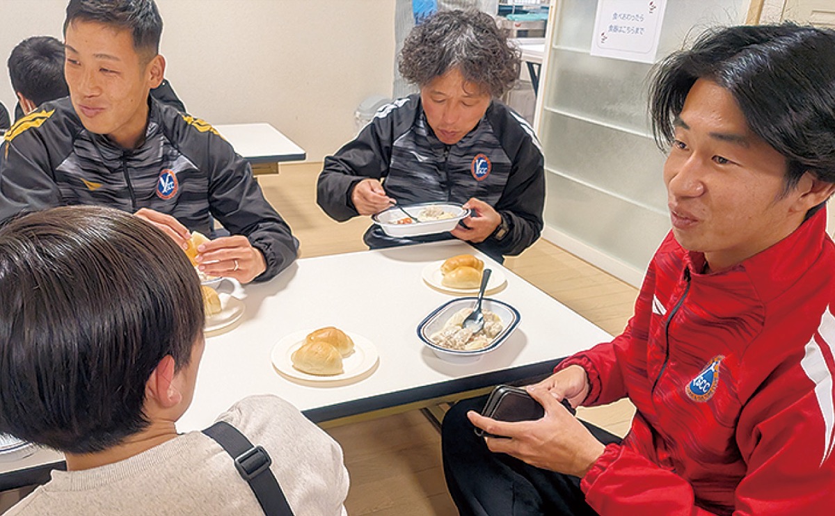 5回目となった11月28日には、同クラブの平野元稀選手とコーチ2人が参加。公園に集まった小学生たちは、3人と一緒にリフティングやドリブルでの鬼ごっこなどを楽しんでいた。「子どもたちが楽しんでくれるならうれしい。少しでもYSCCのことも知ってもらえたら」と平野選手。サッカーの後には、3人も子どもたちと一緒に食事を味わった。