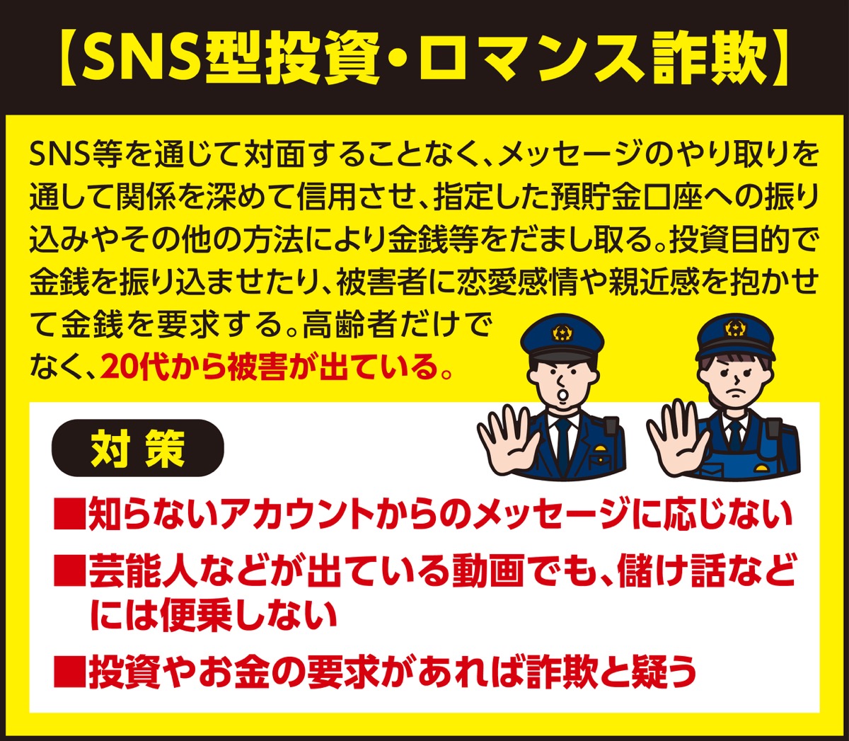 被害にあわないためには「SNSで知らない人からのメッセージには応じないこと」と同署担当者。やり取りをした場合でも、「お金の話が出たら、警察署や身近な人へ相談してほしい」と呼び掛けている。