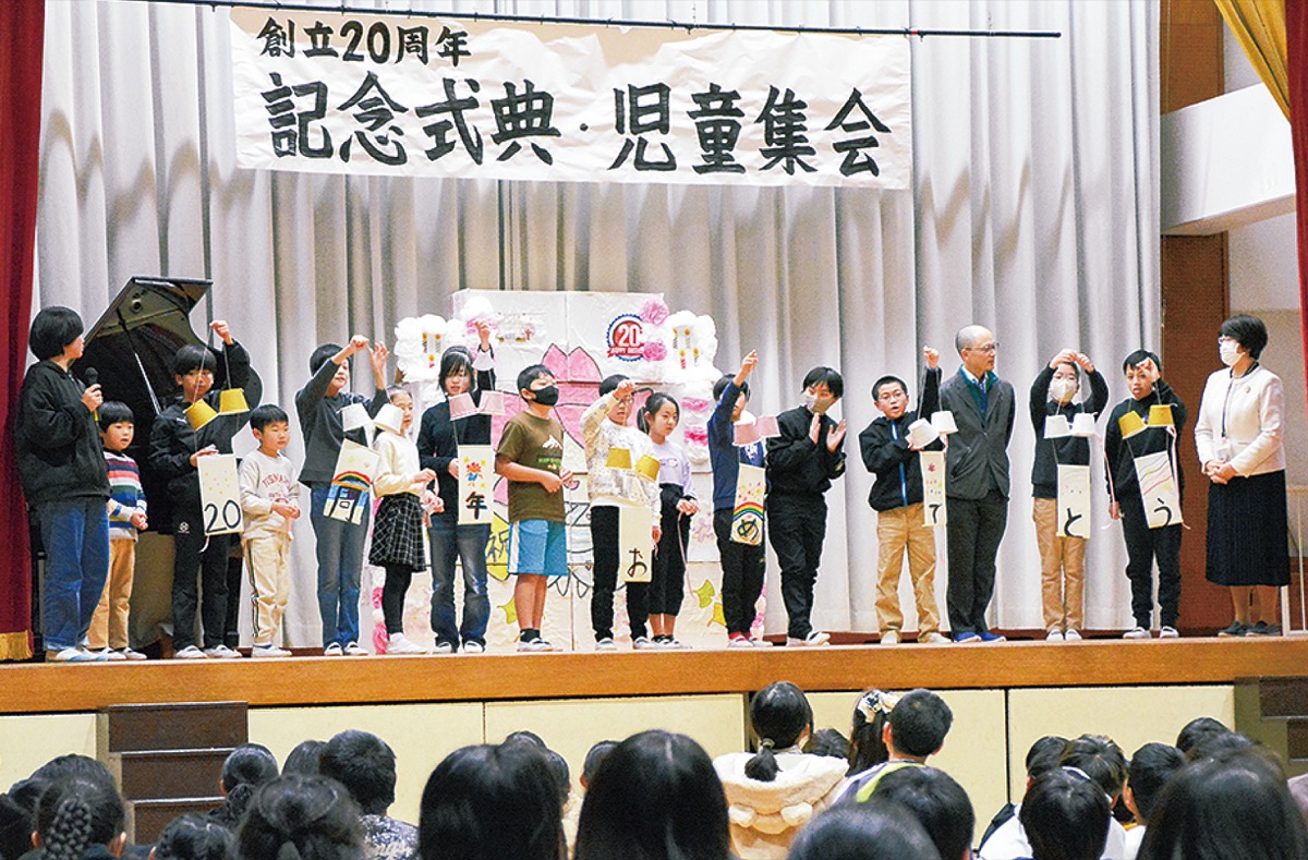 まずは各クラスの代表がパーツを持ち寄って学校の誕生日ケーキを完成させた後、各委員会の児童が行ってきた20周年の取り組みを紹介。また、実行委員会の児童たちが招待された校歌の作曲者と作詞者に、校歌に込められた思いや在校生へのメッセージなどをインタビューした。齋藤校長は「地域の方や先生方、子どもたちなど、皆で作り上げた20周年。この幸せがこれからもずっと続いてほしい」と話した。