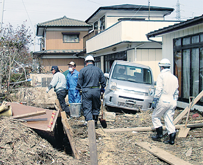 翌日は、朝から仙台市議の紹介で被災者のお宅を訪ね、瓦礫の撤去や敷地に流れ込んだ汚泥をかき出す作業を行いました。津波で流されてきた自動車がブロック塀を倒し(写真)、部屋には天井近くまで到達した津波の跡がはっきりと残っており、ここでも震災(特に津波)被害の大きさを体感することとなりました。
