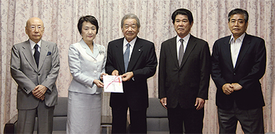 洋光台の磯子カンツリークラブを運営する横浜観光土地(株)(鈴木康浩代表取締役)が9月1日、横浜市役所の林文子市長を訪問。東日本大震災被災者に向けた義援金1000万円の目録と、同クラブのクラブハウスに設置していた募金箱に集まった約55万円を市長に手渡した。