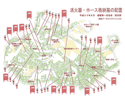 マップの作成は、3月の震災発生を受けて、4月の自治会役員会で議決。その後、役員らが表の形でまとまっていた消火器などの場所を地図上で確認して書き込んでいったほか、インターネットで地域内の公園などを検索し、それぞれの場所ごとに標高を調べた。3ヵ月後の7月には原本が完成。印刷作業が行われ、9月の防災の日に合わせて、約1300世帯の全会員に配布された。