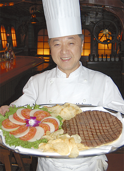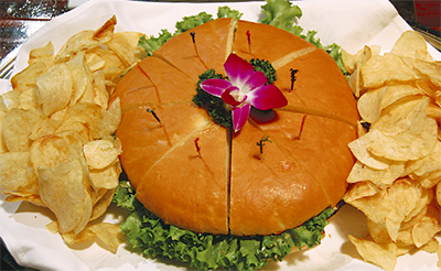 シェフの福士誠さん(磯子区森在住)は、地元にある北欧料理の名店で修行を積んだ後、オーナーに引き抜かれて同店で約30年総料理長を務めている。提供する料理はどれも本格的だが、中でも一際目をひくメニューが「特製司令官バーガー」(上下写真・3050円)。人の顔よりも大きいパテは、国産牛を使用。網目状に焼き色をつけた肉を、特注の手ごね巨大バンズで挟む。トマトやシャキシャキのたまねぎなど野菜もたっぷり。数人で切り分けて食べるのが基本だが、中には1人で挑戦する人もいるとか。8年程前に「店の名物を」というオーナーの要望で出来たそうで、ハンバーガーをつまみにカクテルを飲む姿も同店ならでは。