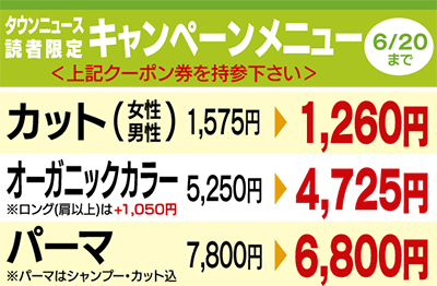 6月20日までは、本紙を持参すると、カットが1260円、オーガニックカラーが4725円からと、特別価格に(下記表)。