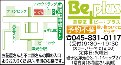JR洋光台駅前の道路を渡ってすぐのショップ27内にある、美容室『ビー・プラス』。