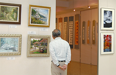 文化祭は、東京佐賀県人会のかささぎ会と若楠会が共催。東京や佐賀、磯子区在住の作家たちと、横浜学園高校アートコースに通う生徒たちが出展している。来館者たちは、展示室に並ぶ絵画や書、写真、刺繍などの作品を鑑賞していた。
