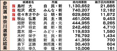 参議院議員選挙の投開票が7月21日に行われた。4議席を11人が争った神奈川選挙区では、自民党の新人・島村大氏(52)が約113万票を獲得し、トップ当選。以下、みんなの党の新人・松沢成文氏(55)、公明党の新人・佐々木さやか氏(32)、民主党の現職・牧山弘恵氏(48)と続き、全国と同様に自民、公明の与党が強さを見せた。