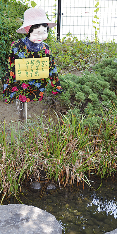 帽子に花柄の服、おかめの面という姿のかかしの胸元には「鳥から魚を守っております」の言葉。流れる小川の中には、金魚などの小さな魚が多数泳いでおり、その言葉通り、小さな魚たちを見守っている。通行中、かかしを見かけた女性は「なんだかほっとする風景ですね」と話した。