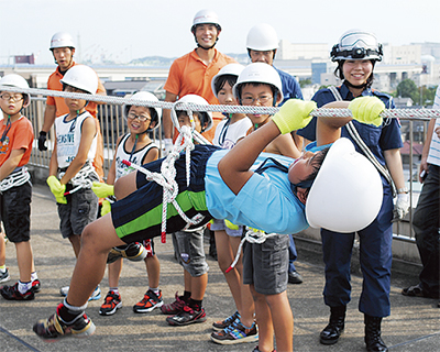 また、署の屋上でロープを渡る訓練も体験。水平に貼ったロープにぶら下がり、腕の力で進んでいくチロリアン渡過に挑戦した。隊員から「安全を保つためには大きな声で返事をしなければならない」とアドバイスを受けると、ロープと自分とを結び付ける際に「カラビナよし」「安全管よし」と、大きな声で確認を行っていた。渡過の終盤で勢いが落ちると、隊員や他の参加者が「頑張れ」と声をかけ、汗だくになりながらも力強く12mのロープを渡りきった。