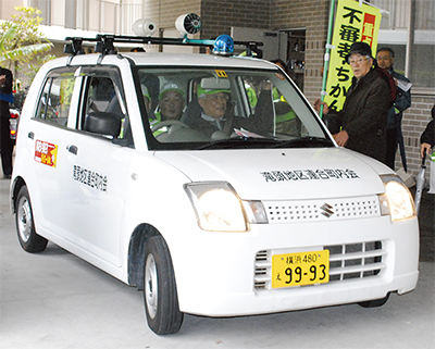 発車式の後、青パトは防犯アナウンスを流しながら、同地区の大通りを試験走行した。