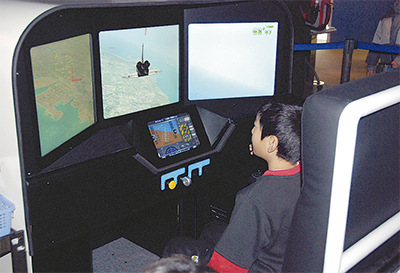 シミュレータでは、スペースシャトルを操縦しての宇宙ステーションとのドッキングやロボットアームを使っての人工衛星キャッチなどを疑似体験することができる。