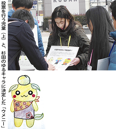 投票活動は、新杉田駅の歩道橋や、らびすた新杉田横の広場、ぷらむロード杉田商店街の事務局前、プララ杉田内など、計6か所で実施。児童たちが通行人に呼びかけながら票を集めた。集まった1000票のうち、723票を獲得した「ウメニー」が、杉田のゆるキャラに決定した。