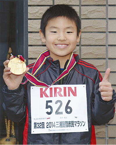 3月2日に三浦海岸で行われた三浦国際市民マラソン。800mの砂浜コースを走るキッズビーチラン3年男子の部で、磯子在住で磯子小学校3年生の新井颯太君が優勝した。