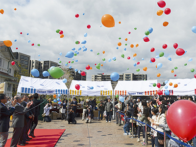 新旧地域住民同士の交流や地域活性化を目的に、月1回開催されるこの市場。開始前には、記念式典も催され、同団地管理組合の岩本偉文理事長や坂本連区長、地元磯子台自治会の彦根秀臣会長らが出席し、来場者と一緒に風船を飛ばしてオープンを祝った。