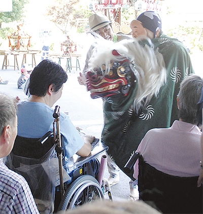 祭りの参加者たちは、横浜市立脳血管医療センターも訪問。祭ばやしの賑やかな音色に誘われて、見物客が続々と正面入口へ集まった。会場では、入院患者たちの早期快復を願った青木社中による獅子舞も披露。軽やかな舞に、拍手が鳴り響いた。