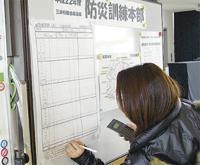 聞いた人は自宅分を含めた6世帯分の安否情報を1枚のカードに記入し、自身の地域の役員に提出。役員はトランシーバで本部へ報告することで、全世帯の安否を把握することができる。