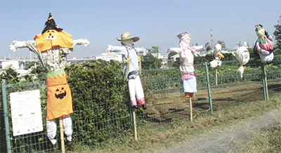 また別名で「かかし祭り」と呼ばれるように、畑の周りでは手作りかかしの展示も行われる=写真。来園者は、子どもたちが作ったパンプキンクッキーの試食もできる。