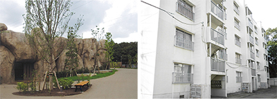 設計を担当した六浦住宅は、4棟約100世帯が暮らす。通常耐震工事では、住居に入っての作業が必要となるほか、補強柱の追加で住空間が狭くなってしまうなどの影響が出る。「住んでいる方の生活になるべく影響が出ないように、そして終わった後も補強が分からないように」をコンセプトに、同社が取り入れたのは、綿密な計算のもと、壁や柱に溝を入れる耐震スリット。外壁などに溝が入っている点以外、工事前との違いはほとんど見られない。室内に入っての工事も1戸だけで済んだ。