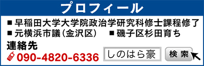 横浜市会議員を務めてまいりました、しのはら豪(39歳)です。岩崎幼稚園、杉田小を卒業した磯子区は、私を育ててくれた故郷です。